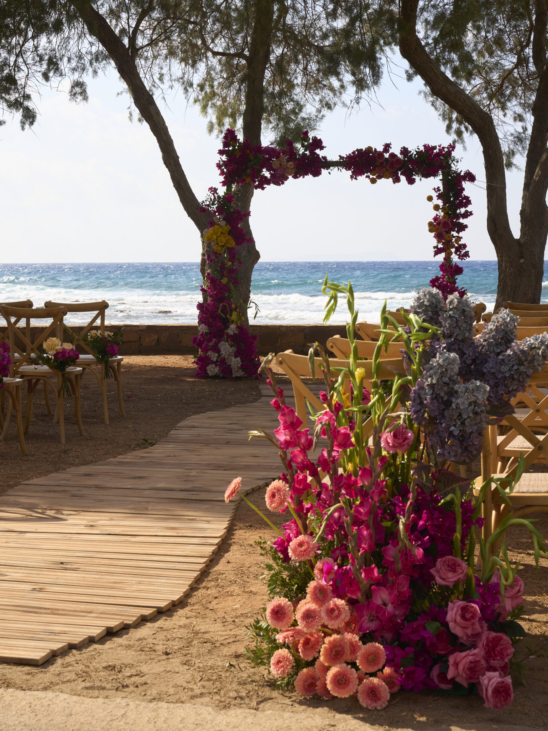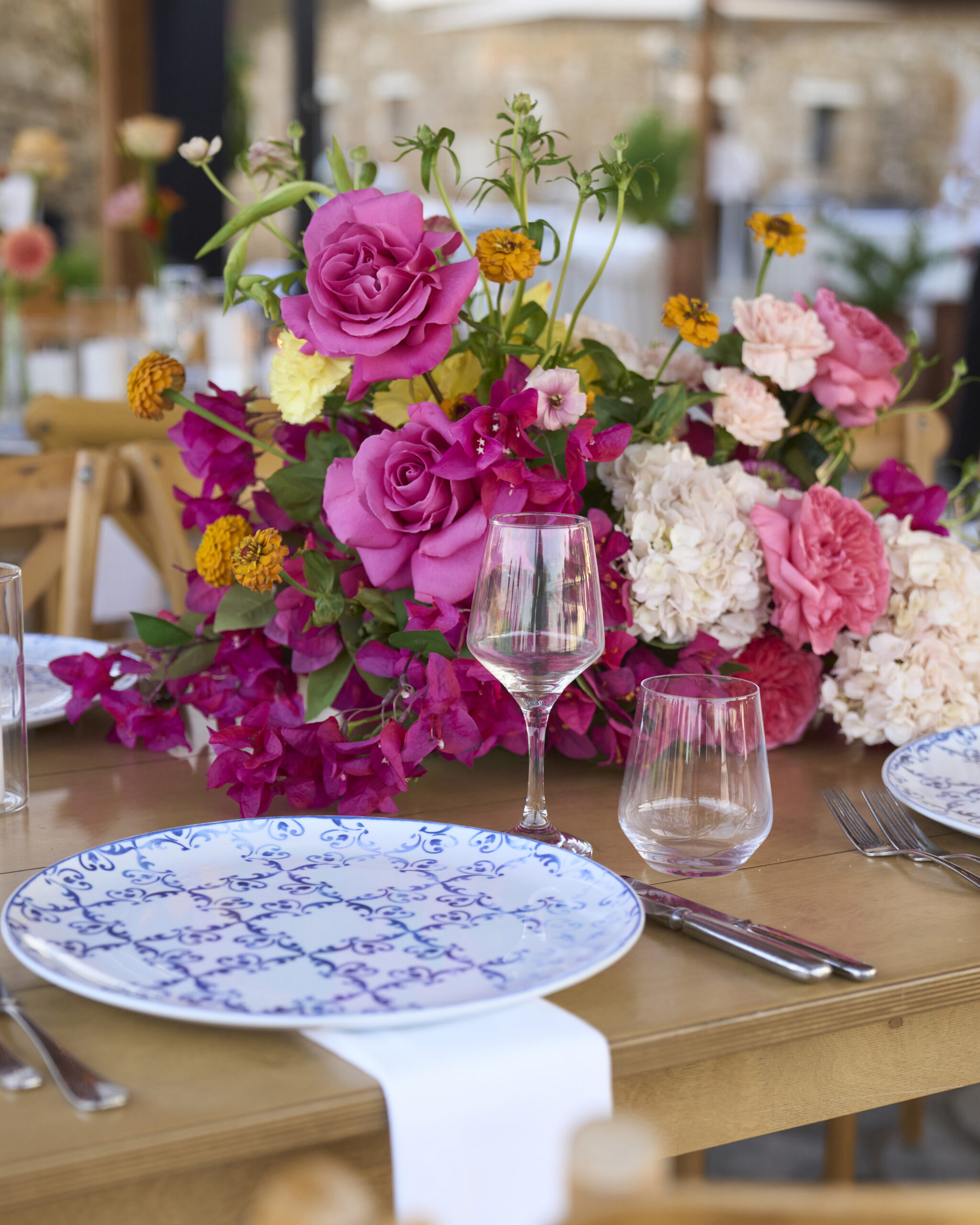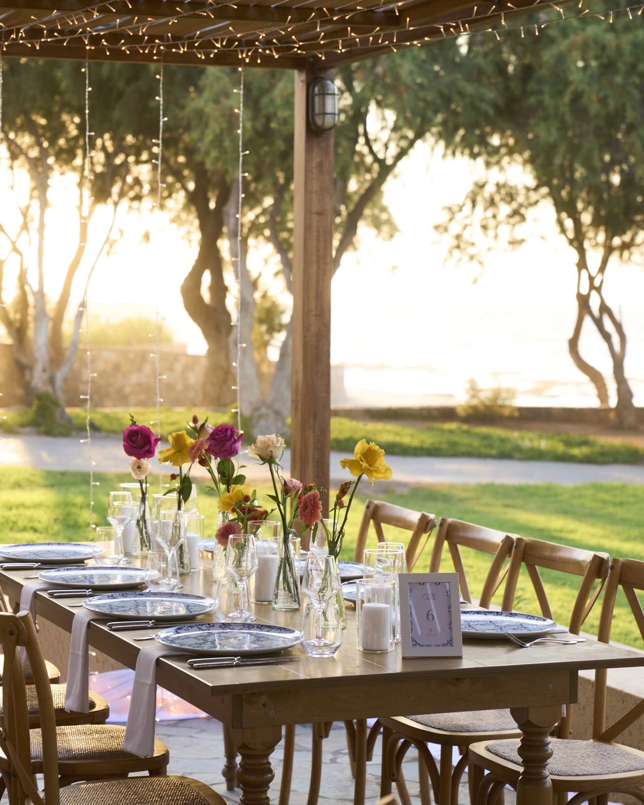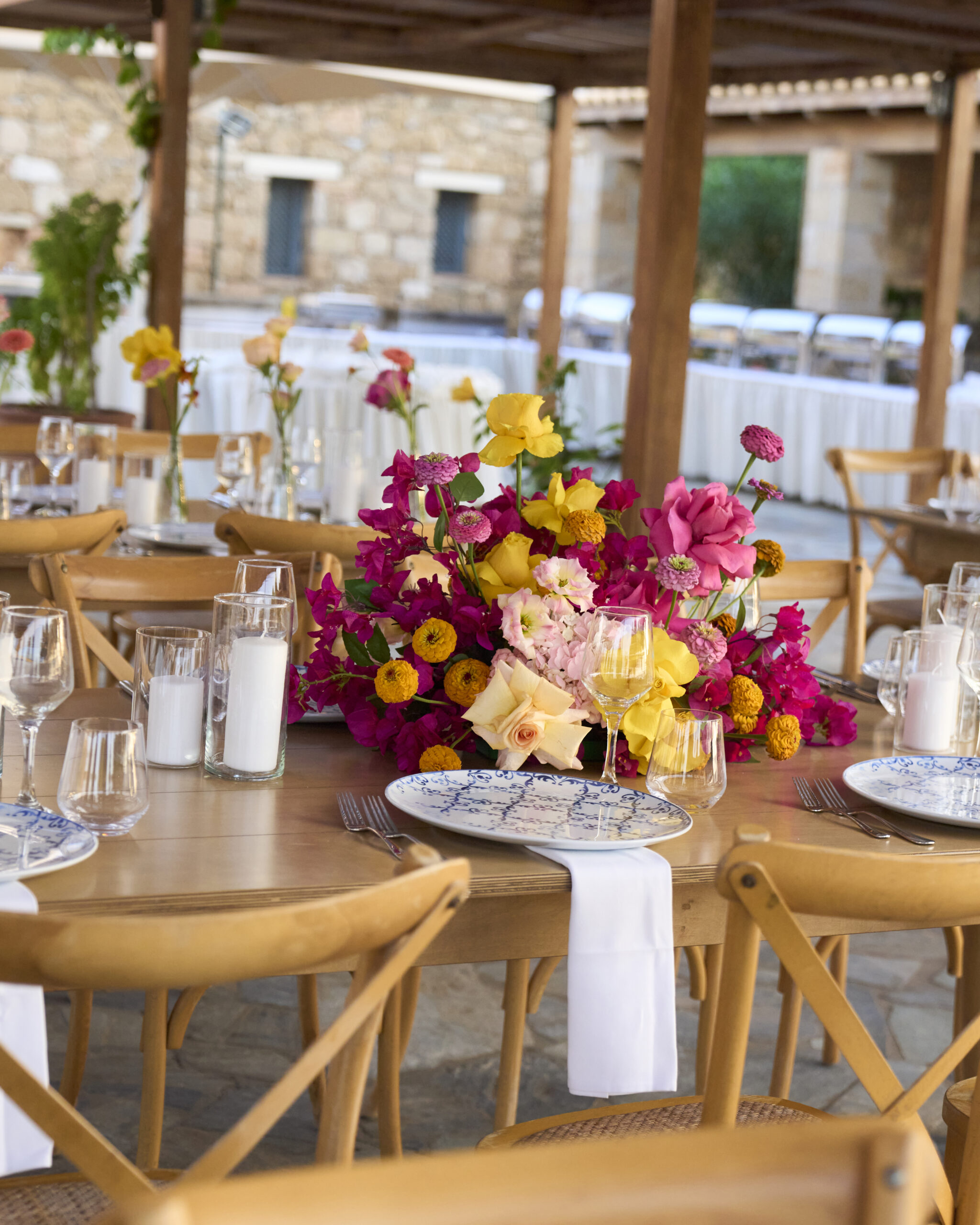 Their ceremony took place beneath the shade of tamarisk trees, with the Aegean Sea as a cinematic backdrop and an arch bursting with bougainvillea, garden roses, and zinnias. The reception carried the same vibrant energy—tables dressed with patterned blue plates, natural wood textures, soft candlelight, and floral arrangements in rich pink, yellow, and coral tones. Every detail reflected a modern, editorial approach while honoring the island’s authentic charm.