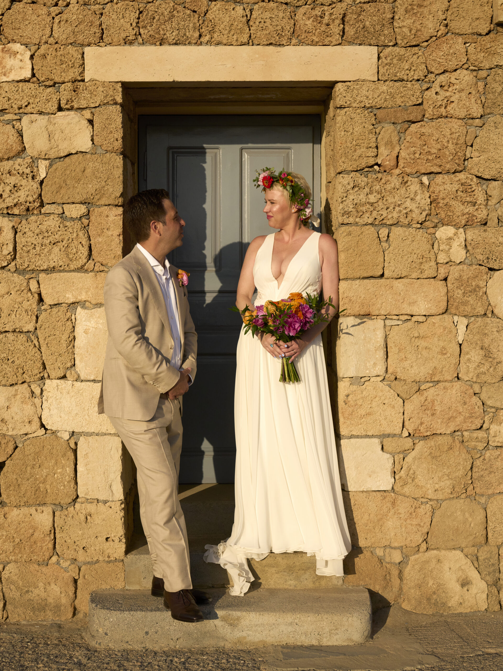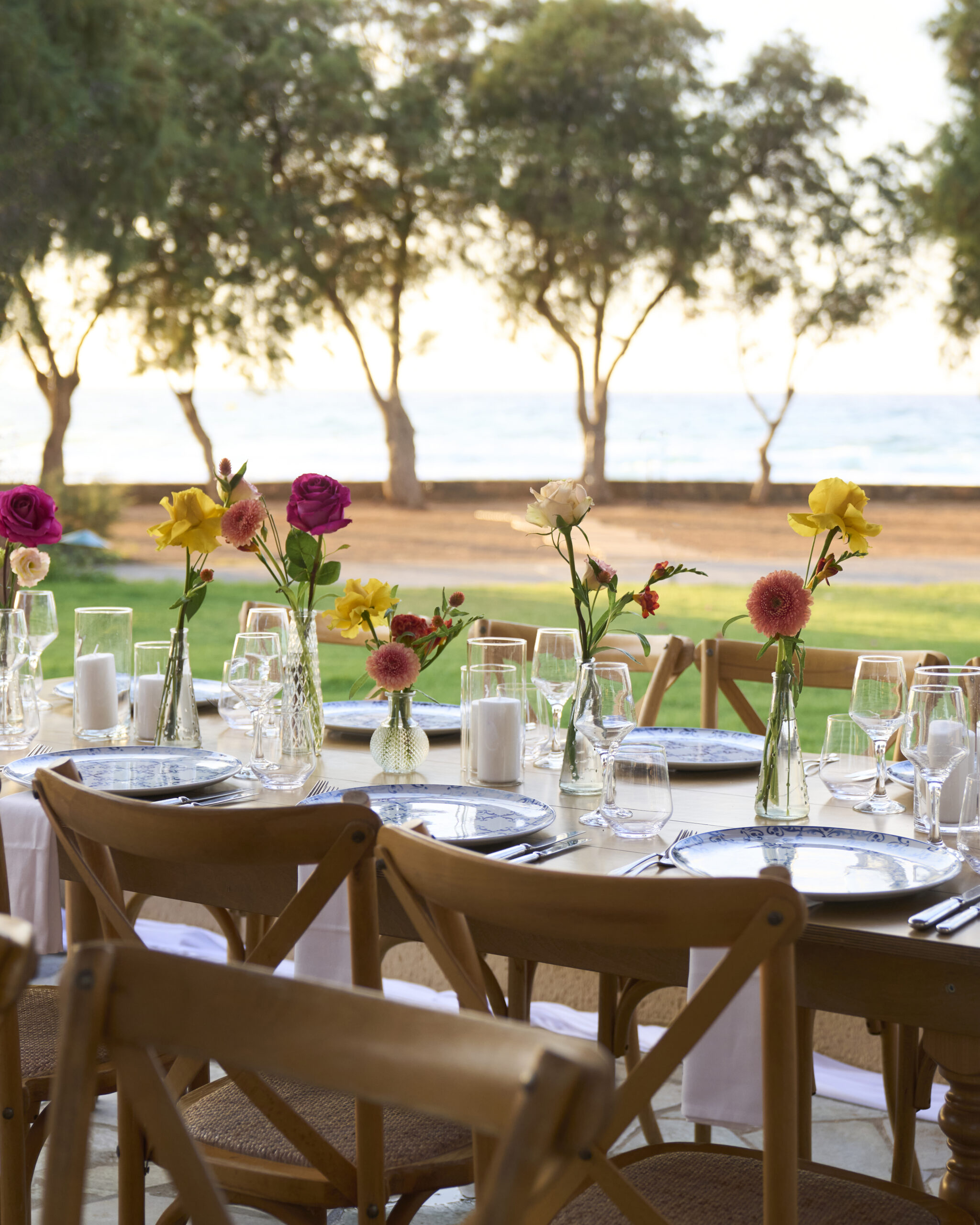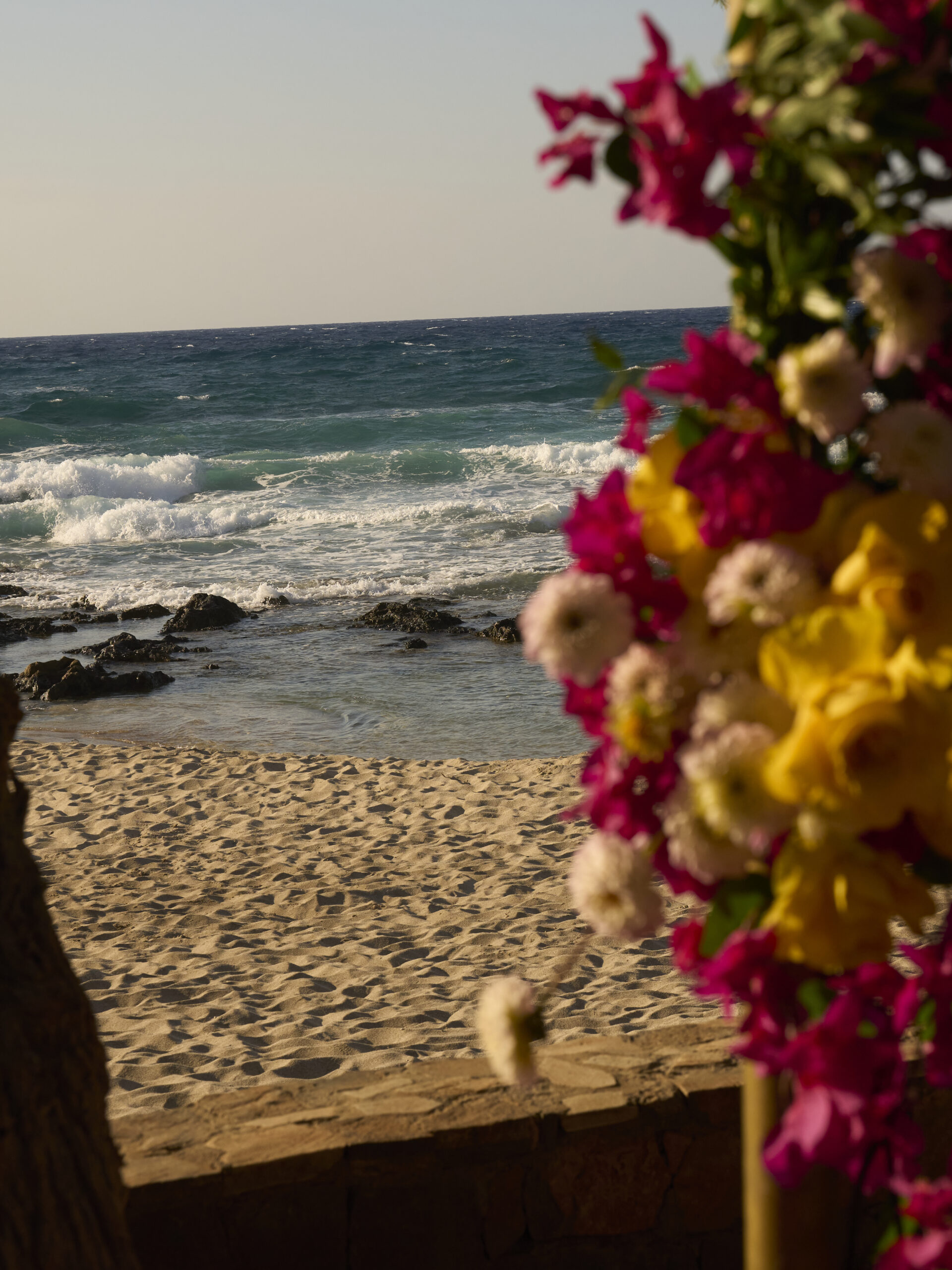 Their ceremony took place beneath the shade of tamarisk trees, with the Aegean Sea as a cinematic backdrop and an arch bursting with bougainvillea, garden roses, and zinnias. The reception carried the same vibrant energy—tables dressed with patterned blue plates, natural wood textures, soft candlelight, and floral arrangements in rich pink, yellow, and coral tones. Every detail reflected a modern, editorial approach while honoring the island’s authentic charm.