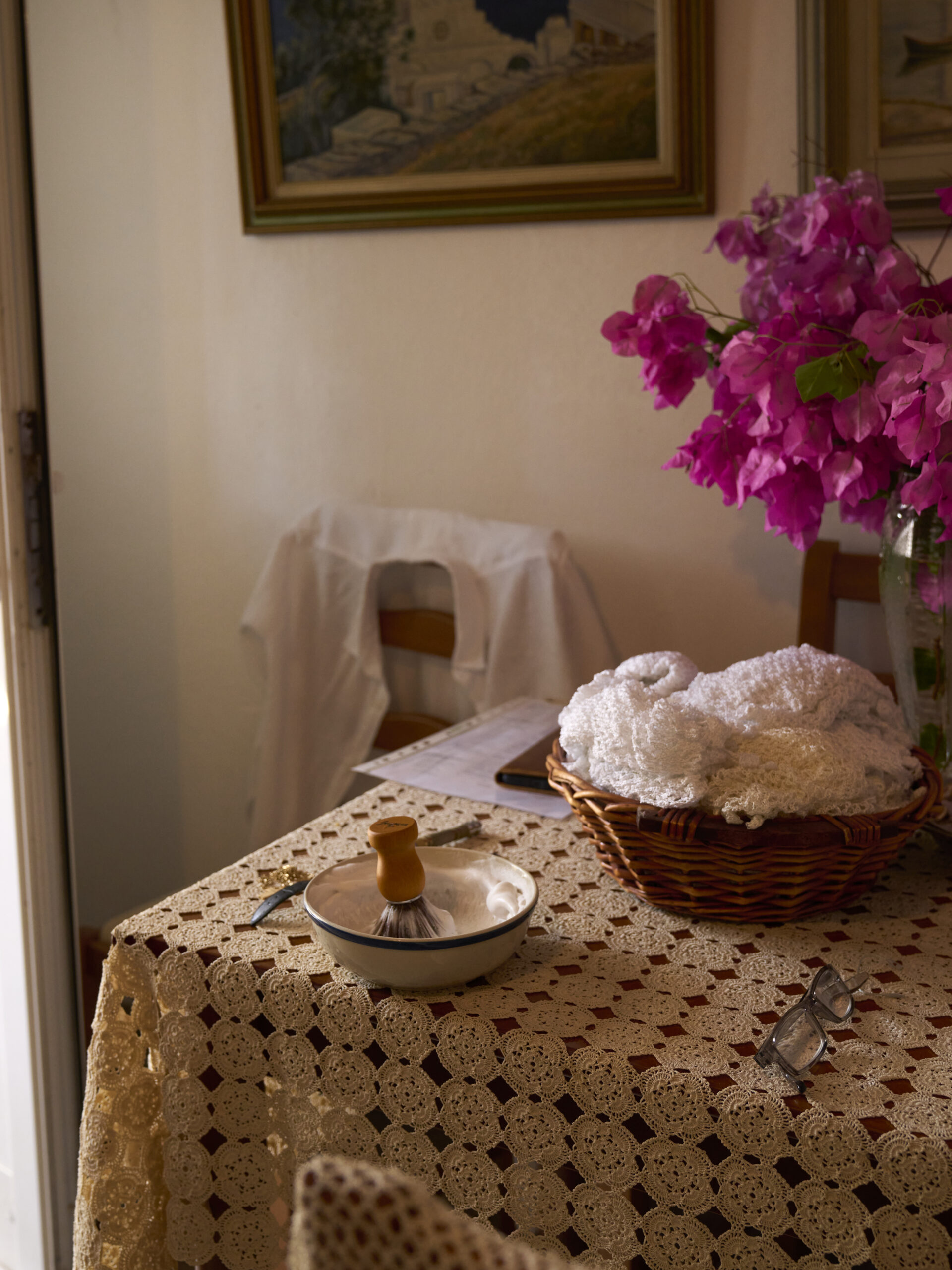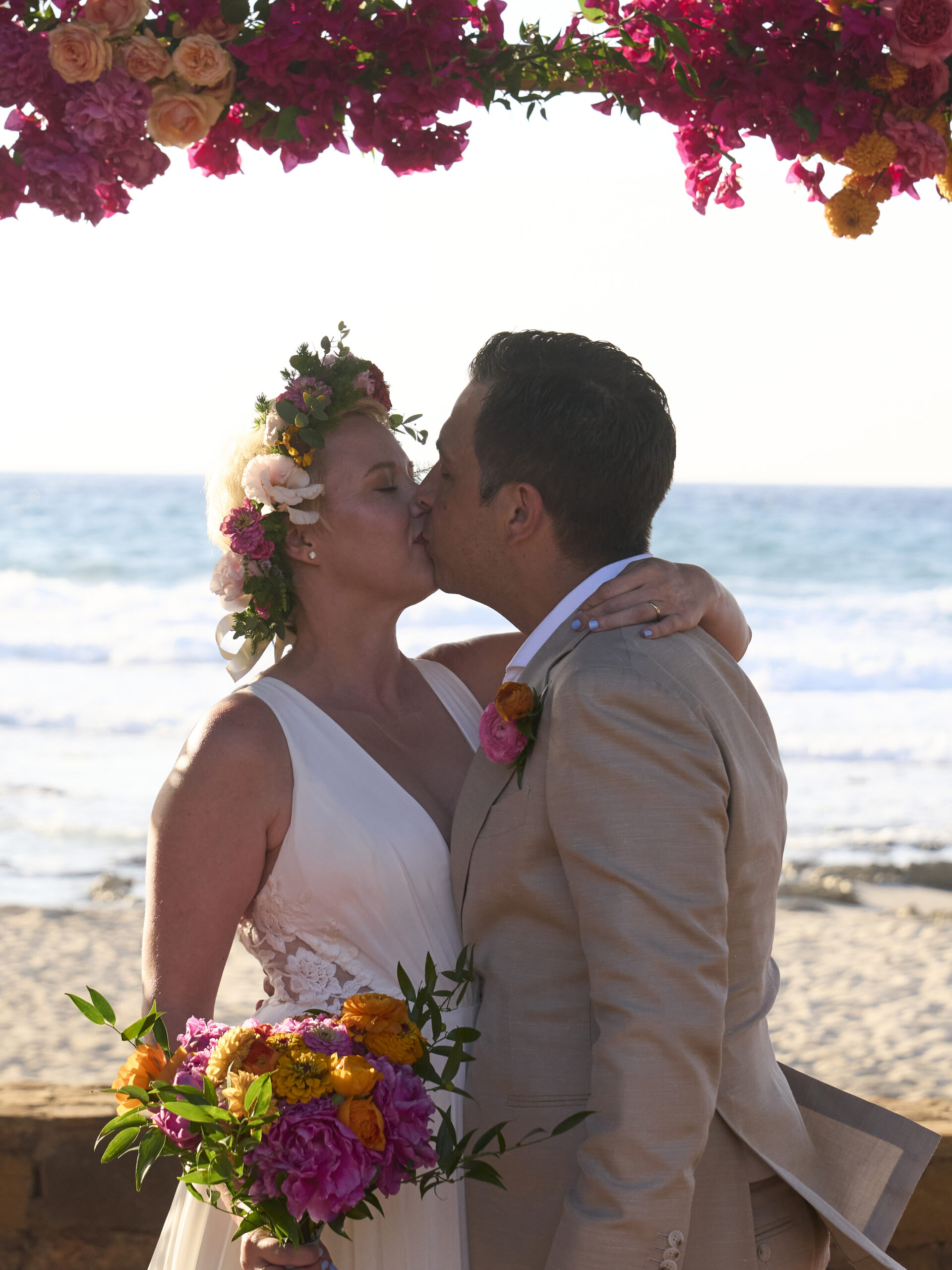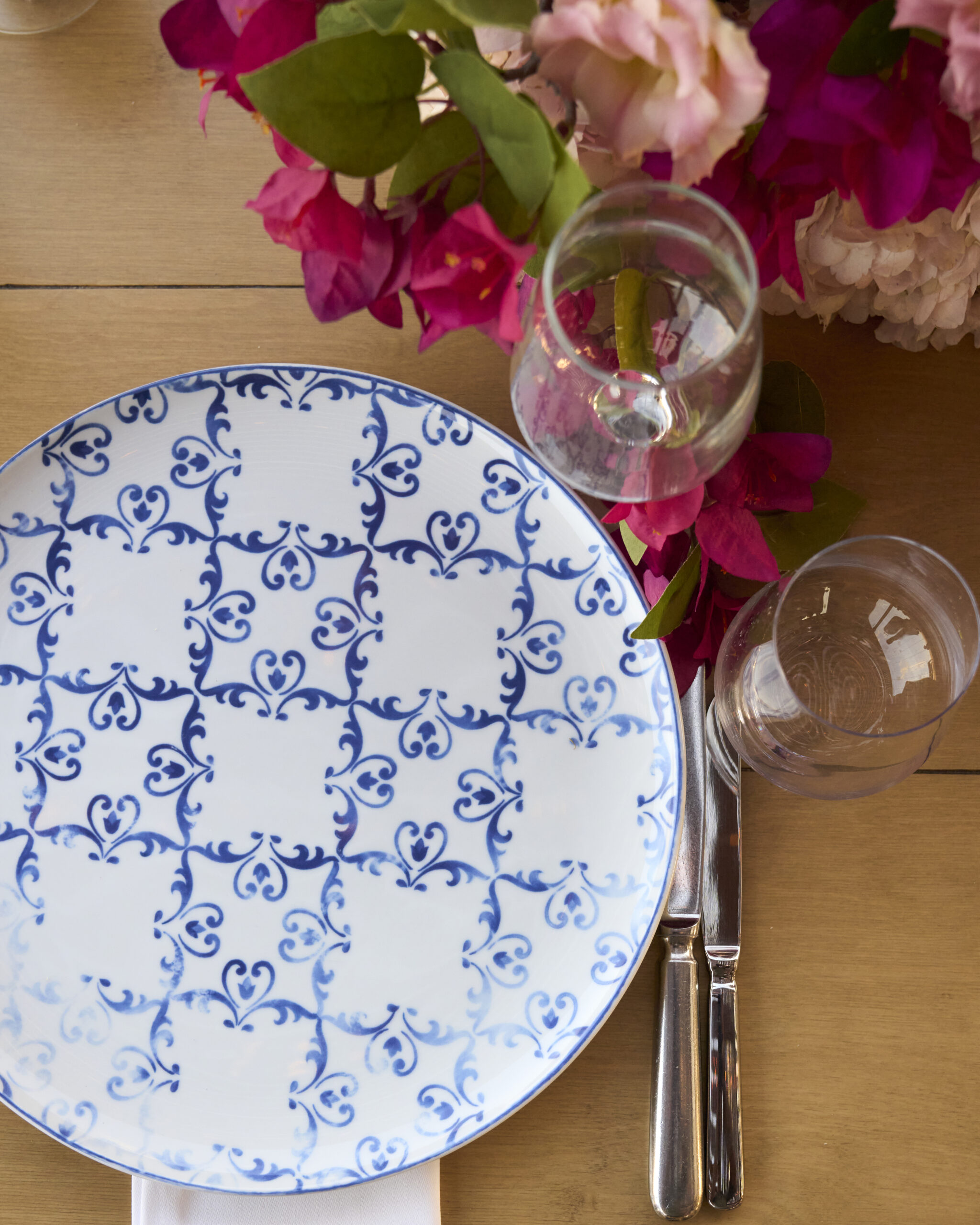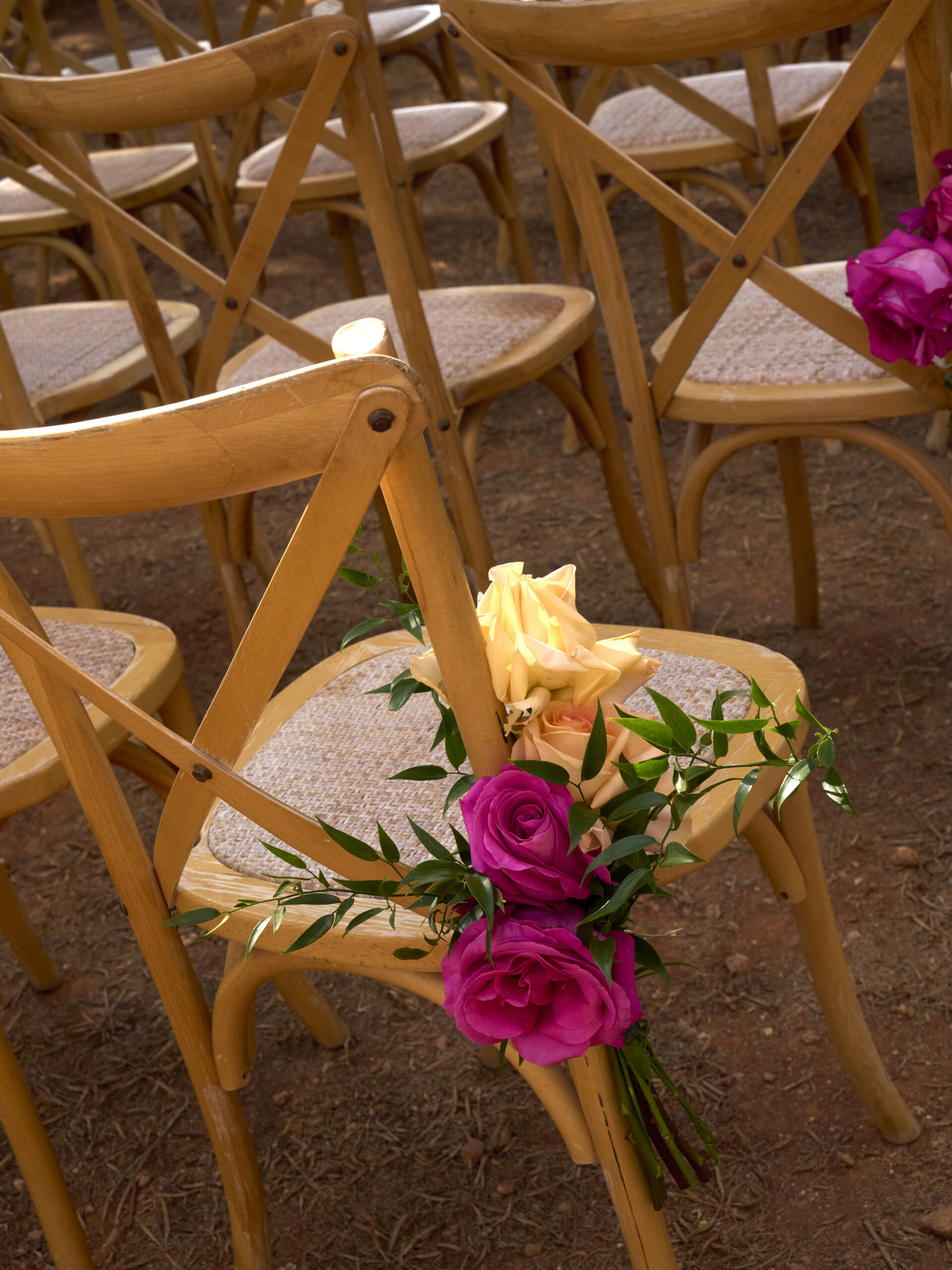 Their ceremony took place beneath the shade of tamarisk trees, with the Aegean Sea as a cinematic backdrop and an arch bursting with bougainvillea, garden roses, and zinnias. The reception carried the same vibrant energy—tables dressed with patterned blue plates, natural wood textures, soft candlelight, and floral arrangements in rich pink, yellow, and coral tones. Every detail reflected a modern, editorial approach while honoring the island’s authentic charm.